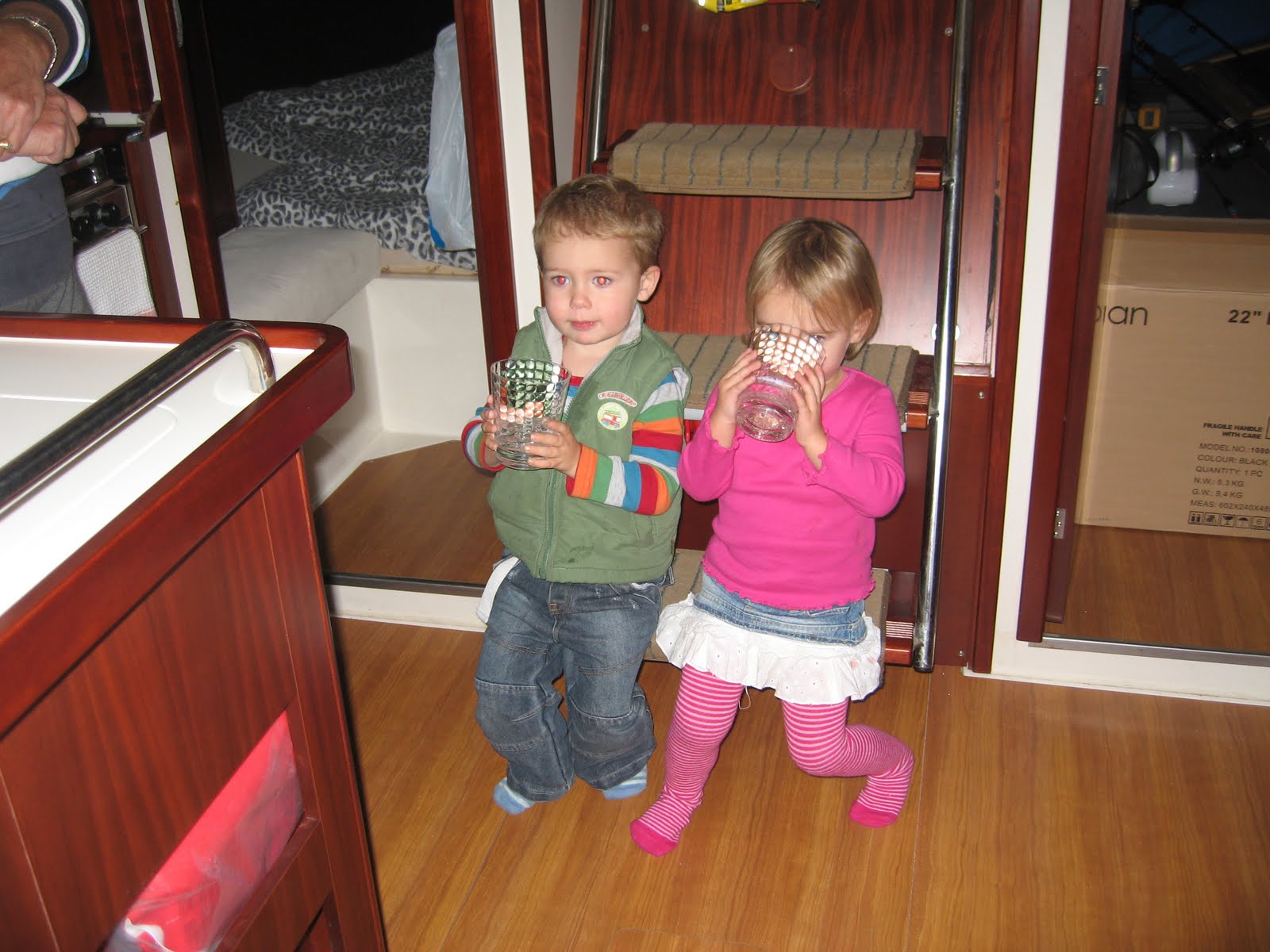 Late afternoon, David, Justine and their twins (Christian & Cassea) came to visit us at the marina to check out the boat. It was a good chance to have a relaxed chat and a glass of wine, and as you can see from the photograph below the kids settled in to boating life quickly.